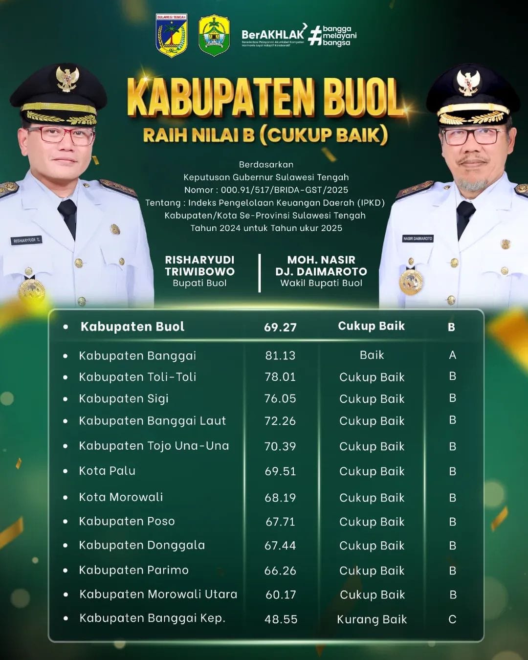 Dalam penilaian Indeks Pengelolaan Keuangan Daerah (IPKD) Tahun 2024 untuk tahun ukur 2025, Kabupaten Buol meraih nilai 69,27 dengan predikat B (Cukup Baik).